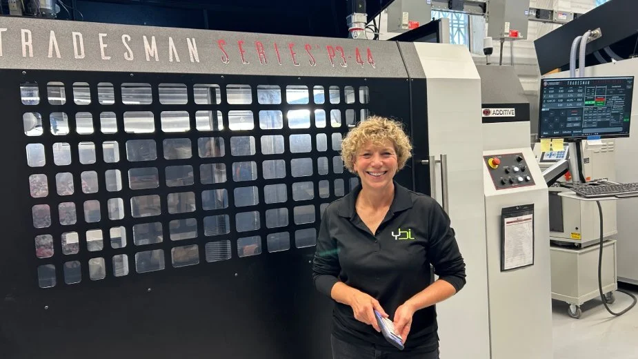 YBI CEO Barb Ewing stands next to a large 3D printer. (Photo: The Business Journal)